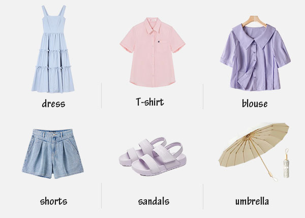 Tops: In June, short-sleeve clothes like T-shirt or blouse are suitable to the weather. Girls can wear the light and beautiful dresses too.Bottoms & shoes: Girls can choose comfortable baggy pants or shorts to dissipate the heat. For shoes, a pair of sandals can be suitable to the weather.