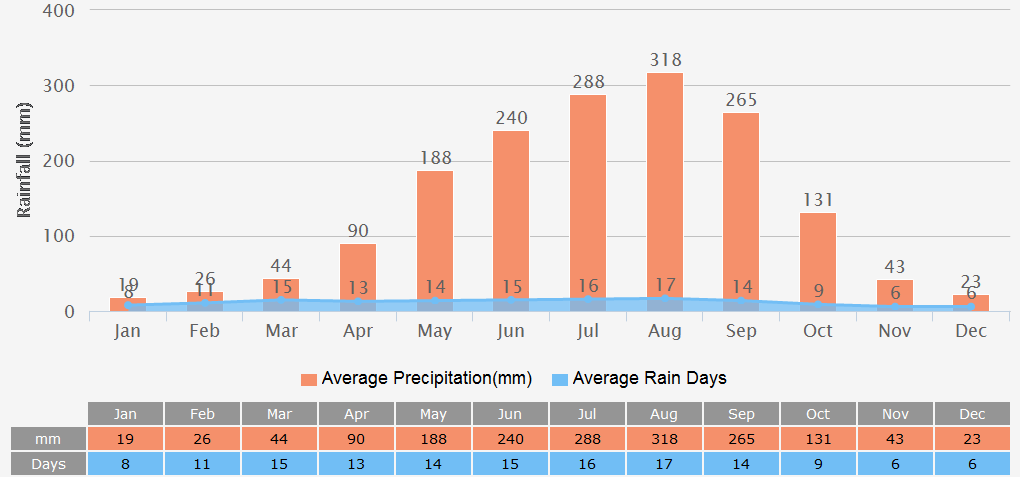Weather:Hanoi’s summer is scorching: temperatures above 35℃ (95℉) are quite common, and extreme highs of 39 to 42℃ (102 - 108℉) can last for several days, discouraging you from stepping out of your hotels. In addition, in summer, air convection is intense and thus rainfall is exceptionally abundant. Rainy days account for about half of the time period, with an average monthly rainfall of over 280 mm. Sudden downpours often trap you in a street corner cafe.