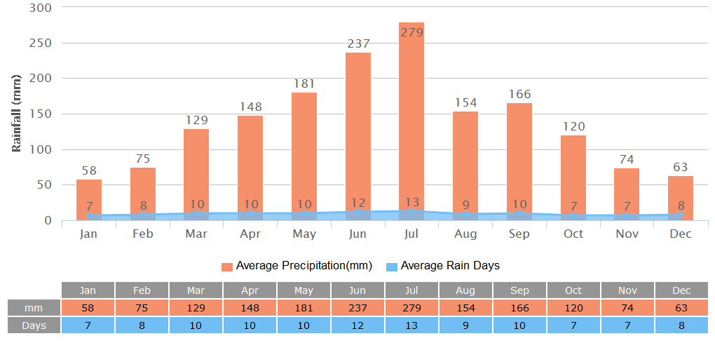 Rainiest Months: June: 237.4 mm & July: 279.9 mm