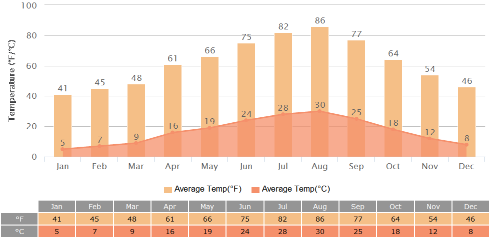 Located in the western part of Japan, Kyoto experiences a subtropical monsoon climate with four distinct seasons: pleasantly warm spring from March to May, hot and humid summer from June to August, comfortably cool autumn from September to November, and relatively dry and cold winter from December to February. The varying weather conditions contribute to distinctive natural scenery here: delicate cherry blossoms are in their full bloom from late-March to early-April, and fiery maple foliage is at its peak from mid-November to early-December.Temperature