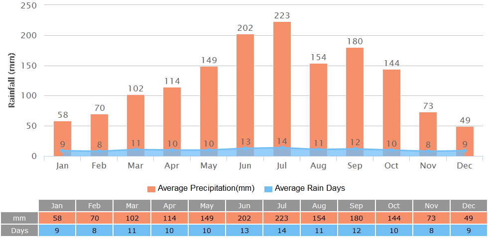 Under the impact of monsoons, seasonal differences also lie in precipitation of Kyoto, and the period from May to September features relatively high precipitation above about 150 mm for more than 10 rainy days per month. From early-June to mid-July, Kyoto is in its plum rain season featuring drizzles for constant days and occasional downpours.What is the Wettest Month in Kyoto?