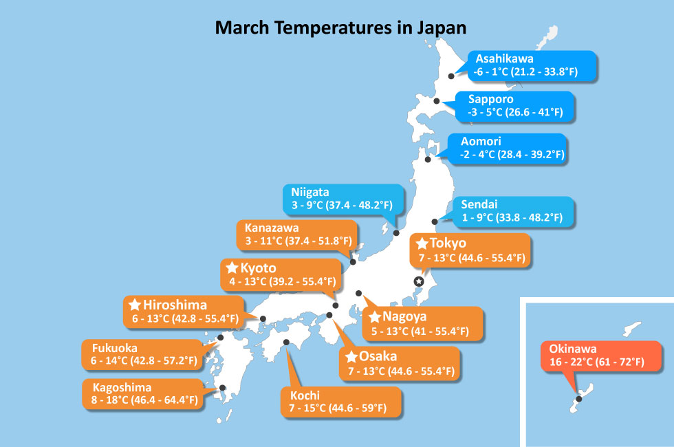 In March, temperatures across Japan exhibit a significant upward trend:Hokkaido, located at the northernmost tip of Japan, remains the only region with lingering coldness throughout the month: During the first half, temperatures hover between -5 and 0 degrees Celsius (23-32 degrees Fahrenheit). By the latter half, they gradually rise to around 0-5°C (32-41°F), and the daily high rarely exceeds 10°C (50°F).