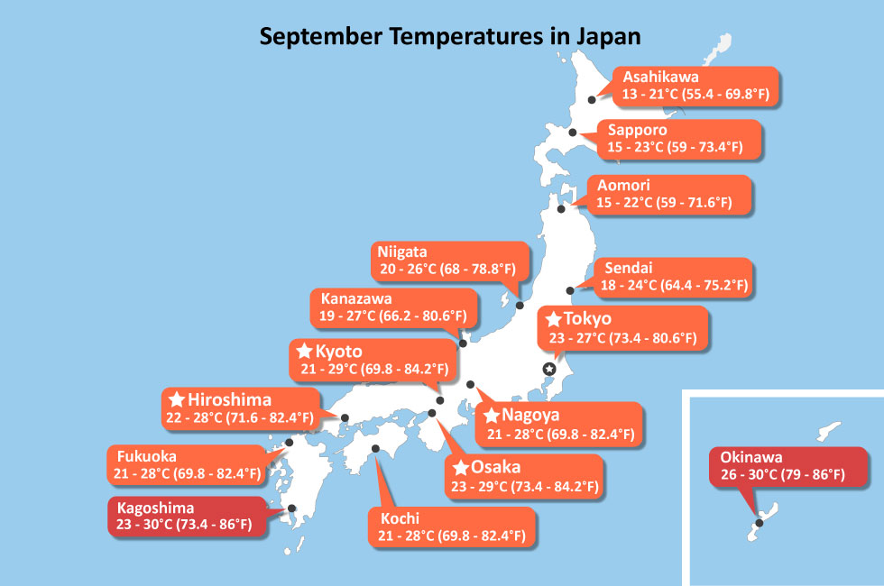 In September, the peak typhoon season, Japan weather is unstable with high precipitation, and you are highly likely to encounter rainy days during your stay. In terms of temperatures, northern regions like Hokkaido are comfortably mild throughout the month, while southern areas such as Okinawa stay hot all month long. Central regions, including Tokyo, experience weather that transitions from hot to relatively cool.Still A Little High Temperature
