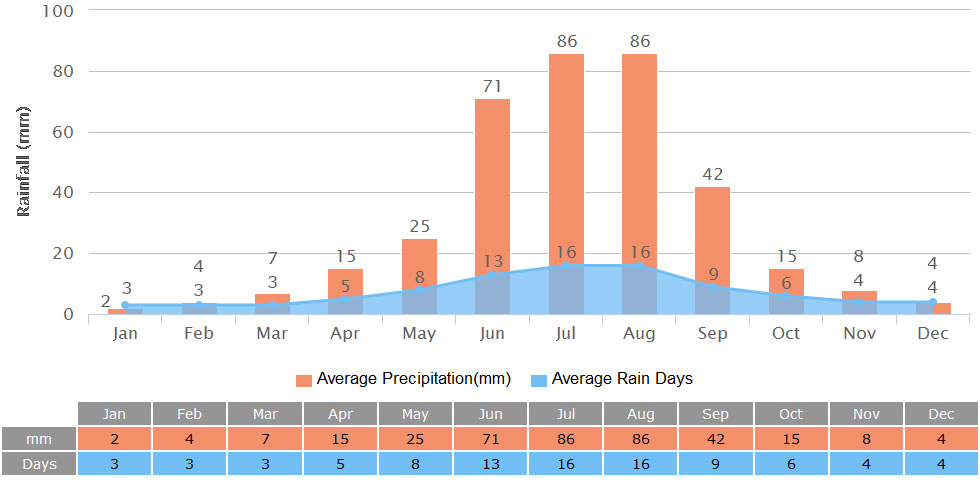 July to August is the rainiest time of the year with the total rainfall accounting for almost 50% of the annual precipitation. Even though, the total number is not high, about 142mm (5.6 in) on average. There are 30 rainy days averagely and heavy rainfall occurs now and then; but luckily, it only lasts for a short time and then turns sunny and clear soon after.