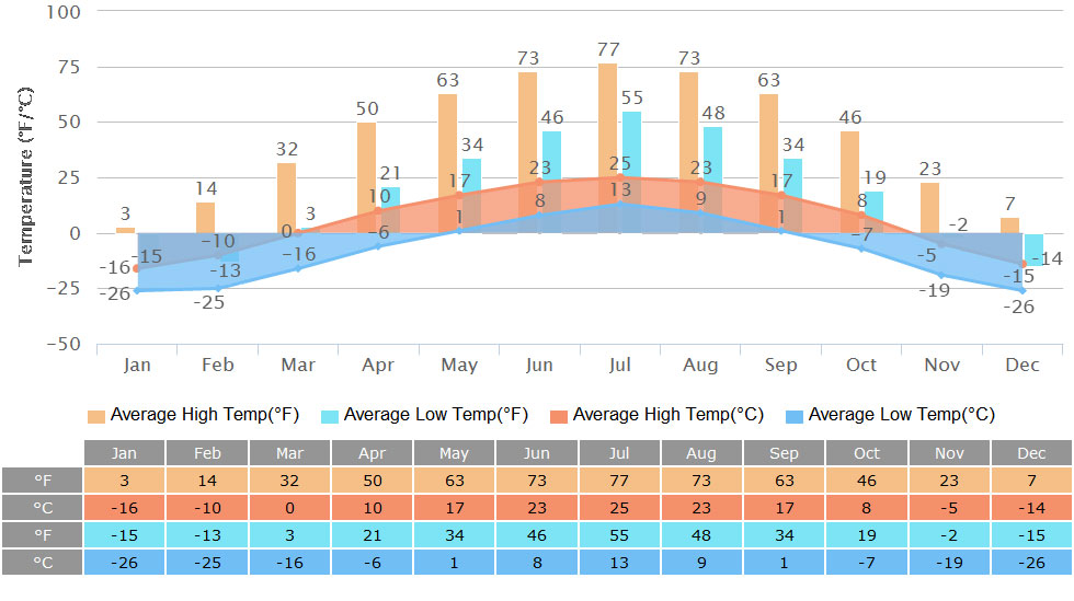 There is an extremely large temperature difference both daily and yearly with the average monthly high temperature ranging from -16 to 22 degrees Celsius (3 - 72 degrees Fahrenheit) and the low values fluctuating between -28 and 10℃ (-18 - 50℉). Sudden temperature drops can be commonly seen as well, and people there might even experience four seasons in only several days.