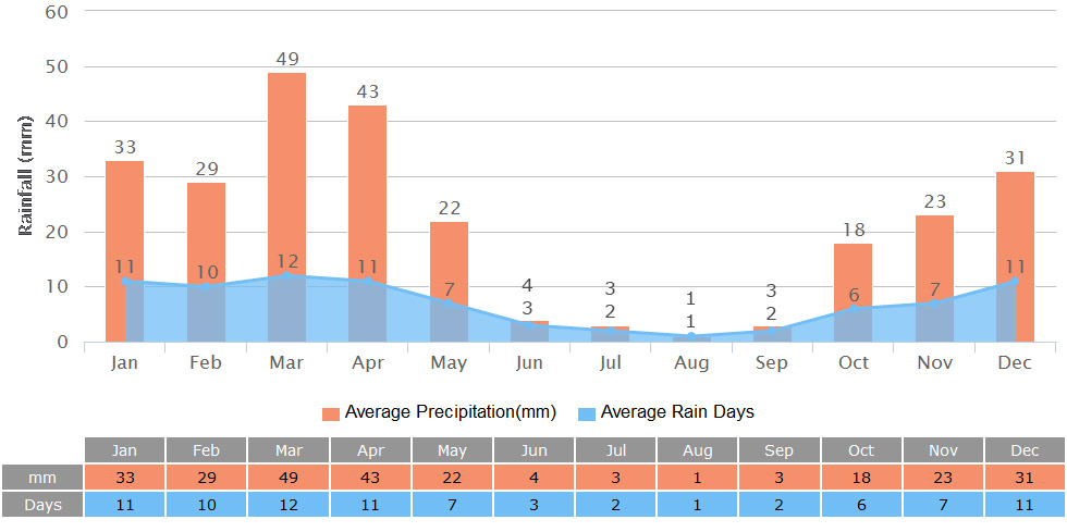 Warmest Months: June & July: 18 - 36°C (64.4 - 96.8°F) averagely; the maximum temperature ever recorded: 48.5°C (119.3°F)