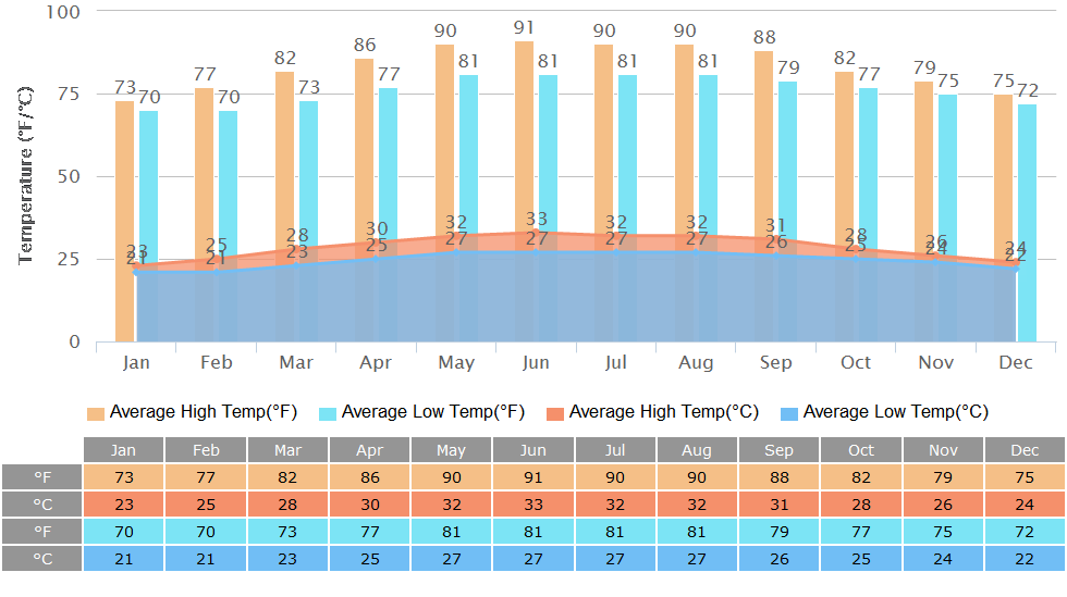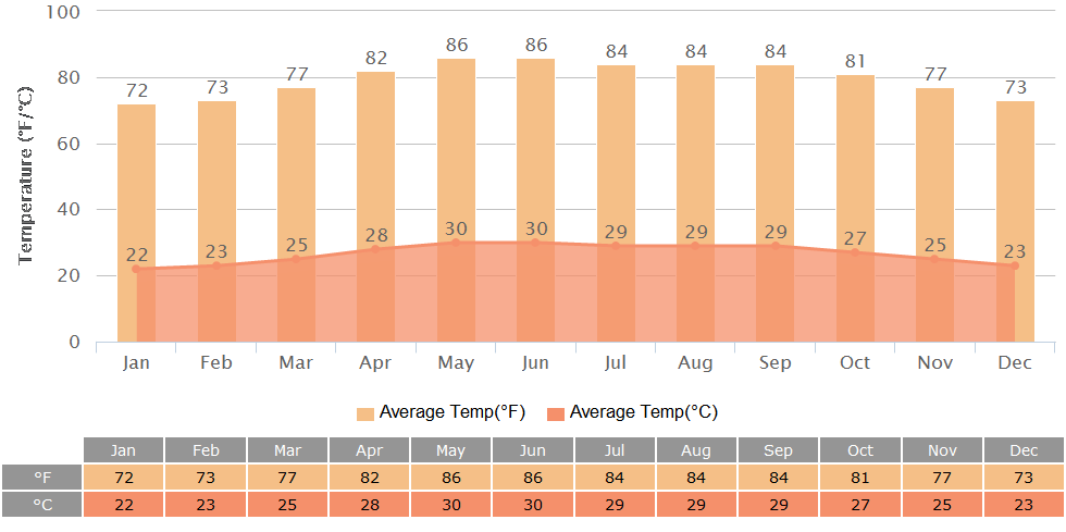 Hoi An, a thousand-year-old ancient town in central Vietnam, has a tropical monsoon climate with warm or hot weather all year round and experiences almost no cold days. Another notable climatic characteristic is its clear distinction between rainy and dry seasons, which run from August to December and January to July respectively. Occasionally, typhoons occur, mostly in the rainy season.Temperature